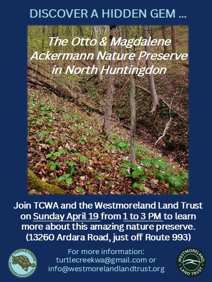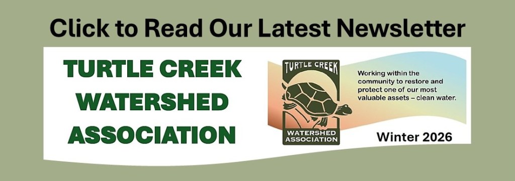 Turtle Creek Watershed Association board meetings are open to the public and are held at 5:30 p.m on the last Tuesday of each month except December. Meetings are held at the Monroeville Municipal Building, 2700 Monroeville Blvd, Monroeville PA.